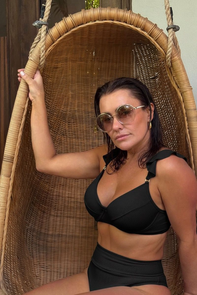 MODELO COM BUSTO ESTRUTURADO COM ARO E DETALHE EM BABADOS NOS OMBROS, TANGA HOTPANTS COM COBERTURA MEDIA NO BUMBUM.